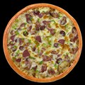Состав: Тесто, сыр моцарелла, соус томатный, бекон, курица копченая, лук красный, шампиньоны, соус барбекю