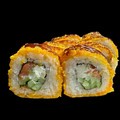 Состав: рис, нори, темпура, панко, сыр сливоный, огурец, лосось, соус унаги, кунжут