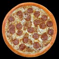Состав: Тесто, сыр моцарелла, соус томатный, курица, шампиньоны, пепперони, маслины, черри, соус сырный.