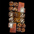 Состав: нори, рис, томаго, снежный краб, тобико, лосось, соус для запекания, унаги, кунжут