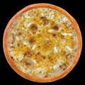 Состав: Тесто, сыр моцарелла ,соус Цезарь, сыр Пармезан, сыр Чеддар, сыр Сливочный.